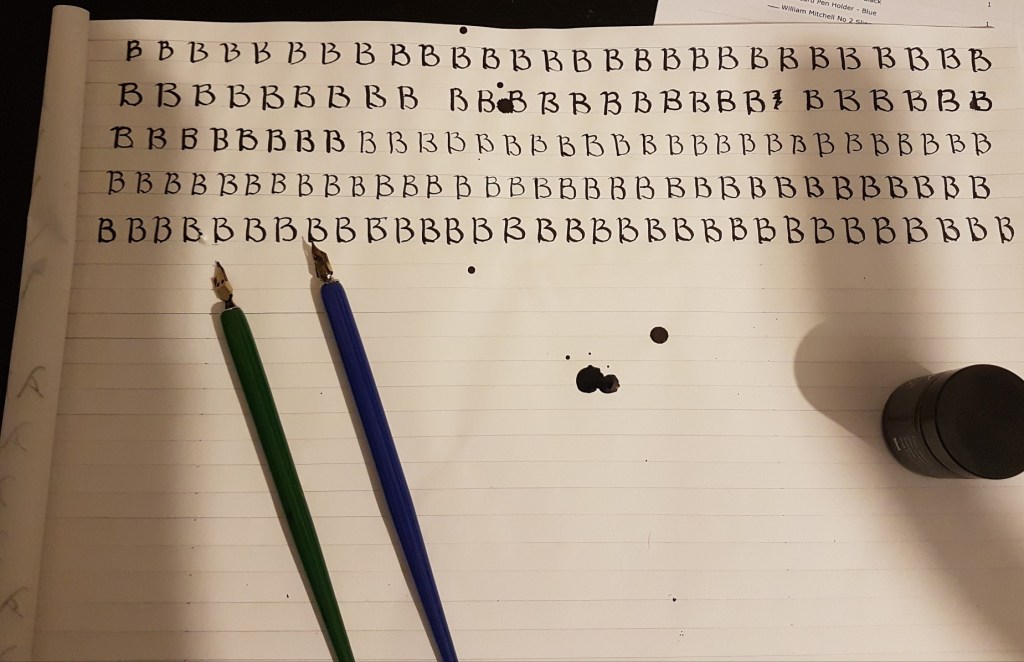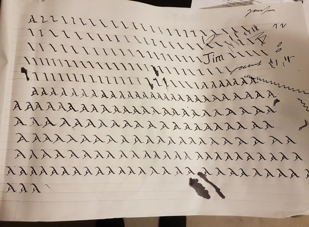 I can’t remember which sized nib I actually used (this post was written retrospectively, about 3 weeks after I actually started learning), but you can see on the third line I decided to switch down to a narrower nib, and by the fourth line towards the end I was getting the hand of ink flow. No where near what I’d call “good”, but it felt like I was getting somewhere, knowing that just doing this over and over would eventually get better.