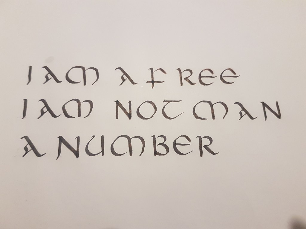 The result? Well. Messy. But fun! I didn’t follow any specific tutorials on what to do, I found a chart of the basic Uncial letters somewhere and followed the strokes to try and reproduce what was there.