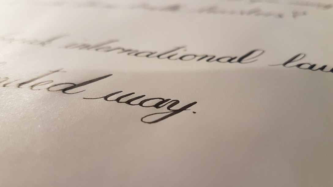 I’m slightly out of practice, and it’s been a couple of weeks since I last had a practice session. You can tell quite clearly with the word spacing between “does” and “break”, and again on the second line, between “specific” and “and”.